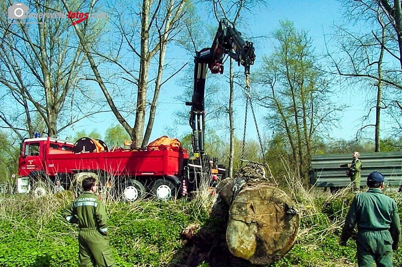 Zwei Bilder aus dem Archiv: Feuerwehrmann mit Kettensäge nach einem Sturmschaden.